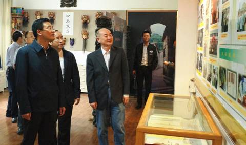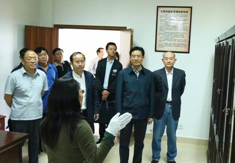 安顺市委常委、市委秘书长、市委统战部部长尹恒斌(左一)在安顺学院党委书记罗荣彬(左二)、院长刘雷(右)等陪同下考察屯堡文化研究中心。